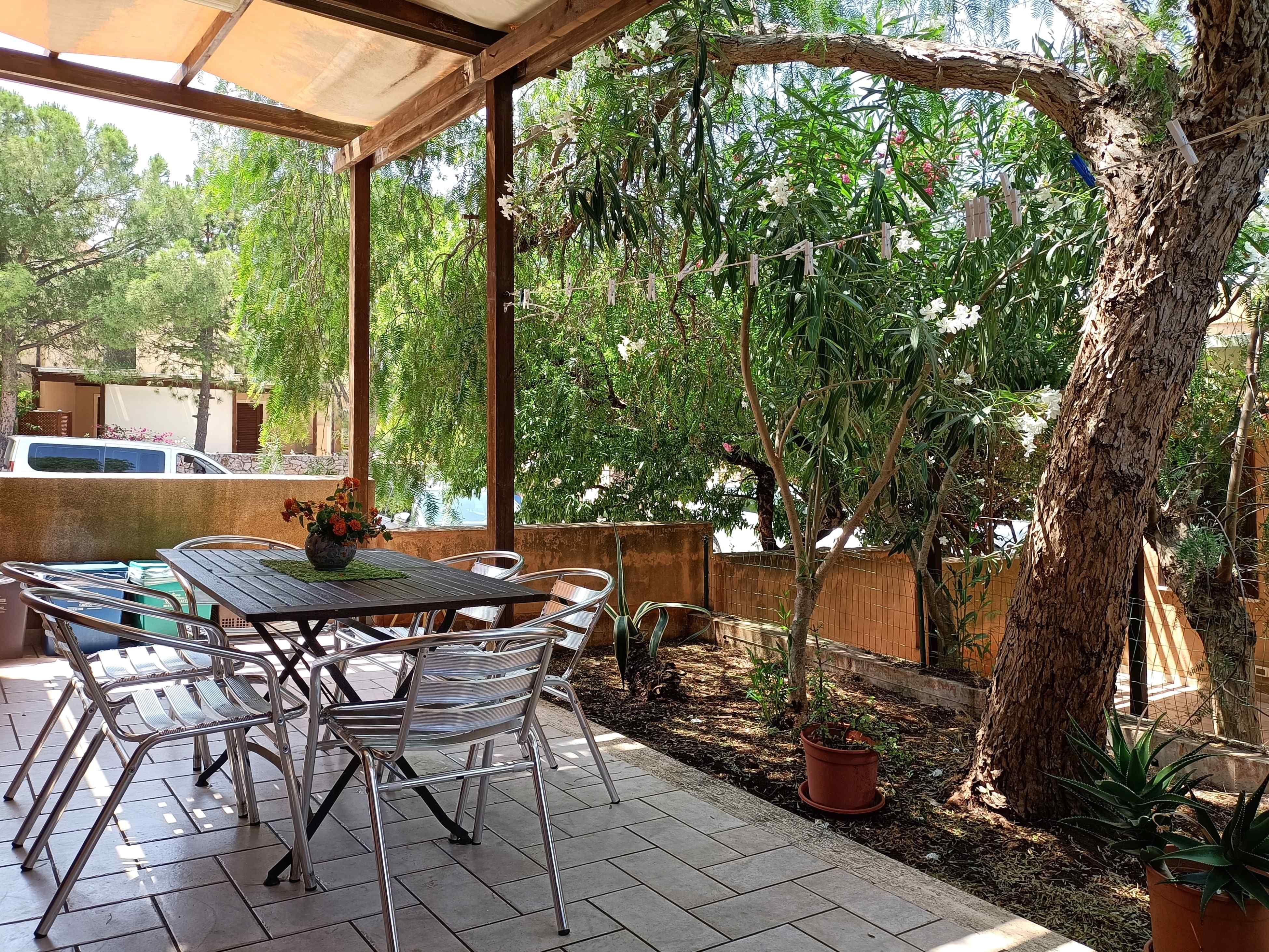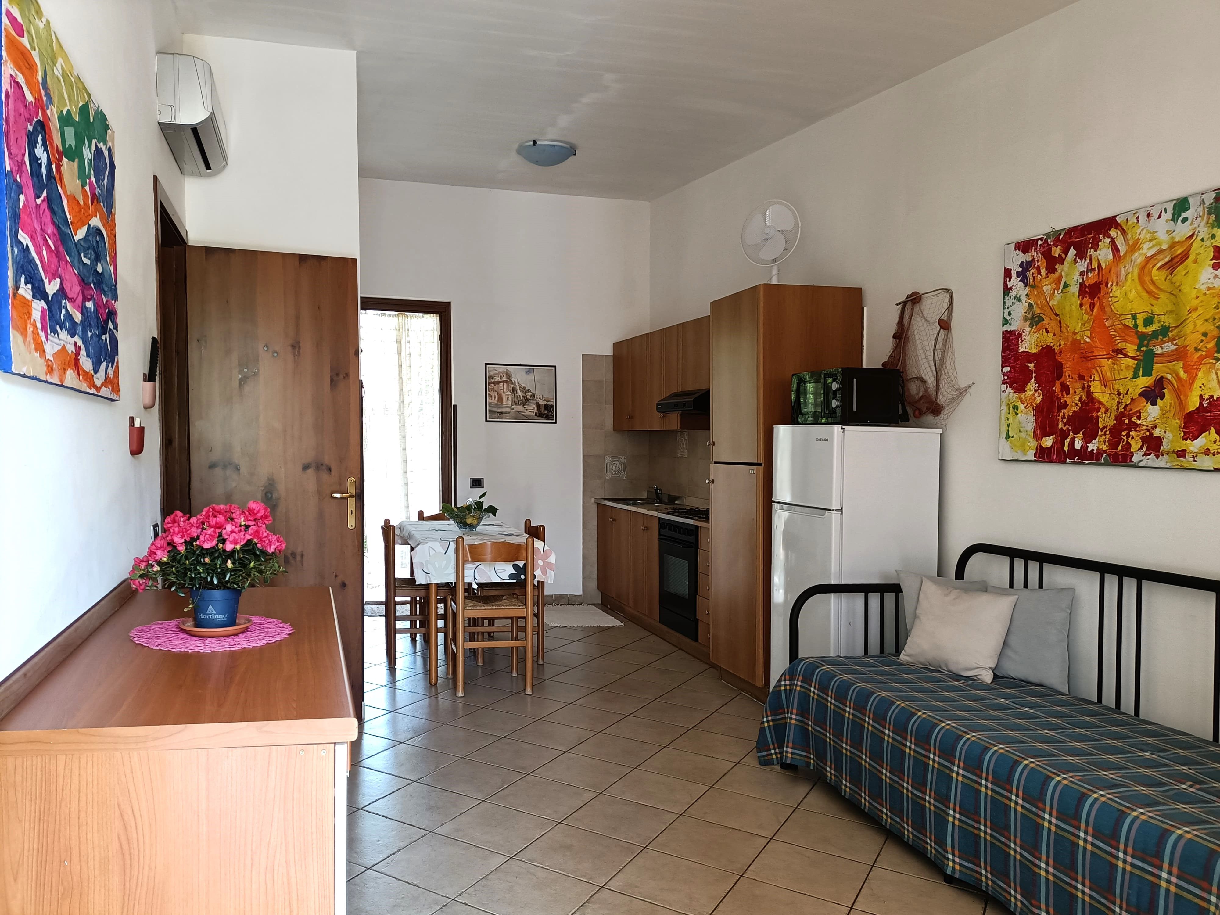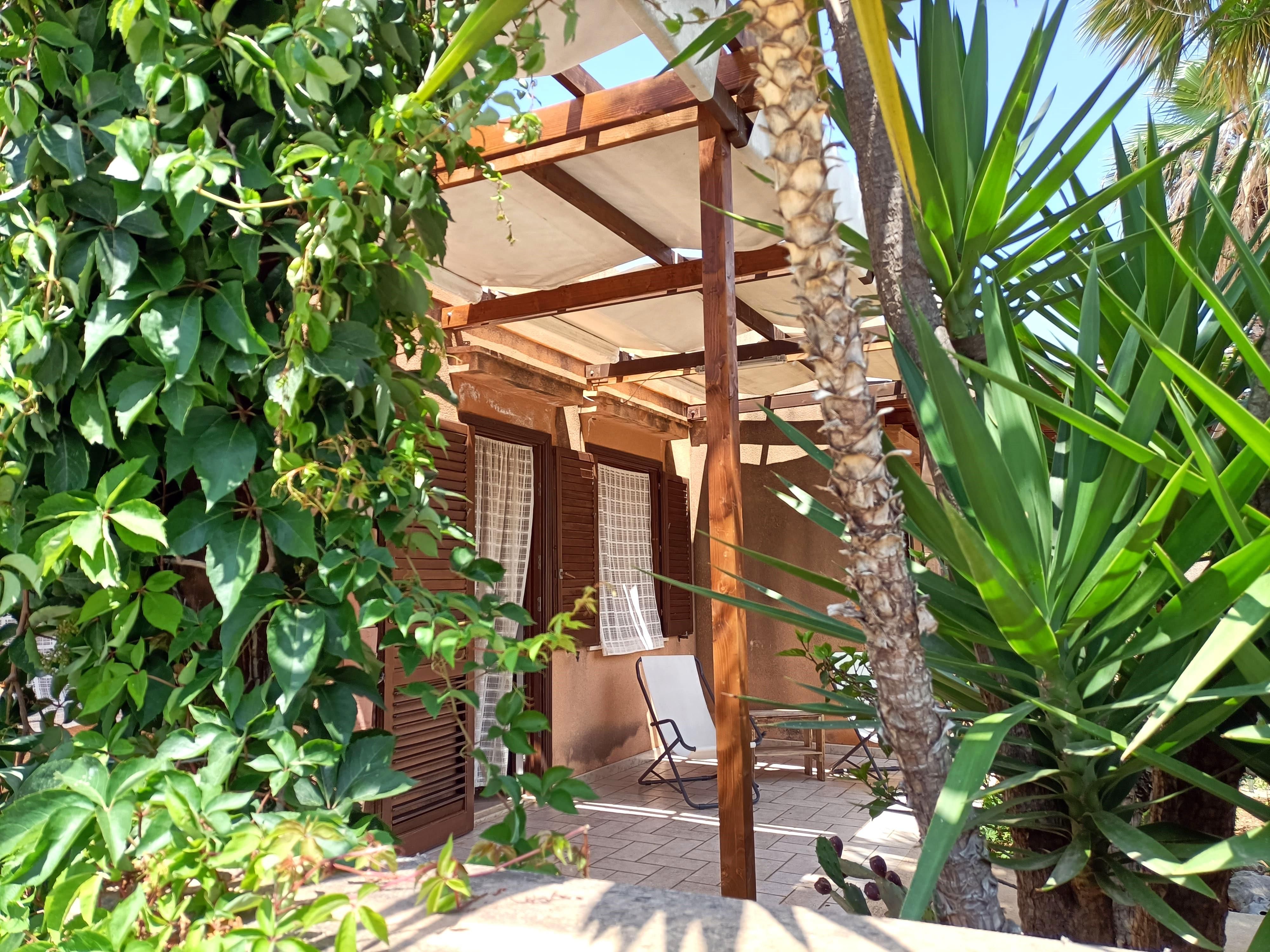 Terraced house on the ground floor located in via Federico II, composed of kitchen with kitchenette and sofa, bathroom with shower, a small room with 2 beds, a double bedroom, tv, air conditioning, washing machine, microwave, hairdryer, iron and ironing board, barbecue, garden with pergola in front and behind and reserved parking space