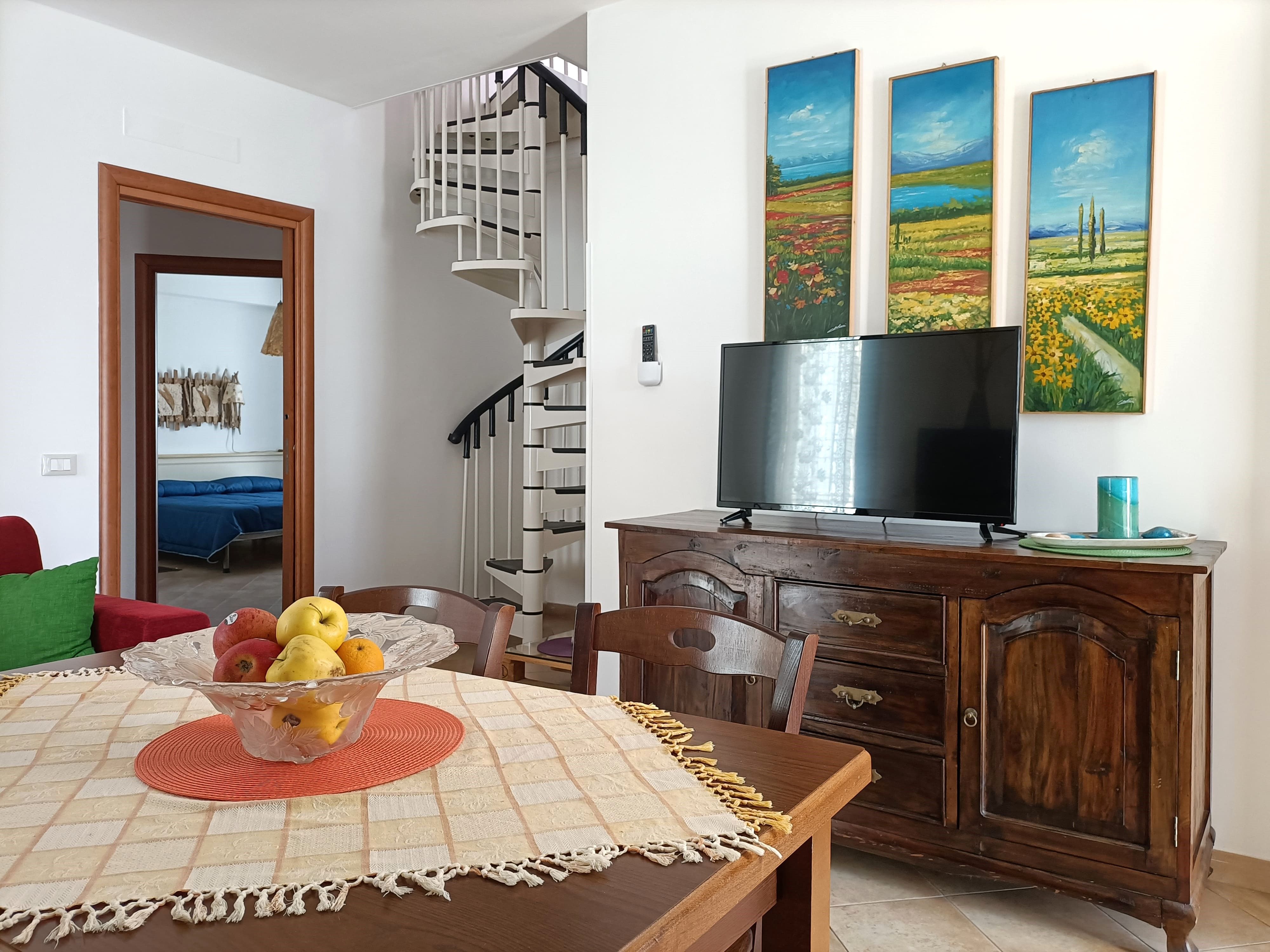 Appartamento di 4 locali di 80 mq al primo piano e mansarda al secondo piano. Arredamento funzionale e confortevole: soggiorno/sala da pranzo con divano letto e TV (schermo piatto). Uscita sulla veranda di 8 mq. 1 camera matrimoniale con climatizzazione e riscaldamento di aria calda con uscita sulla veranda. 1 camera matrimoniale con climatizzazione e riscaldamento di aria calda. Angolo cottura (4 fuochi, forno, tostapane, bollitore elettrico, forno a microonde, frigo con congelatore). Doccia/bidet/wc. Mansarda al piano superiore tramite scala a chiocciola. Disimpegno. Uscita sulla terrazza di 40 mq con vista paese e parziale vista mare. 1 camera, altezza del soffitto 80 - 220 cm, con 2 letti. Doccia/wc. Climatizzazione e riscaldamento di aria calda. Caldaia a gas. Riscaldamento centralizzato con termosifoni in tutti i locali. Mobili da terrazza e mobili da balcone. A disposizione: lavatrice, ferro da stiro, seggiolone, lettino per bimbi fino a 2 anni, asciugacapelli. Internet (wifi, gratuito). Pass parcheggio (1 auto)