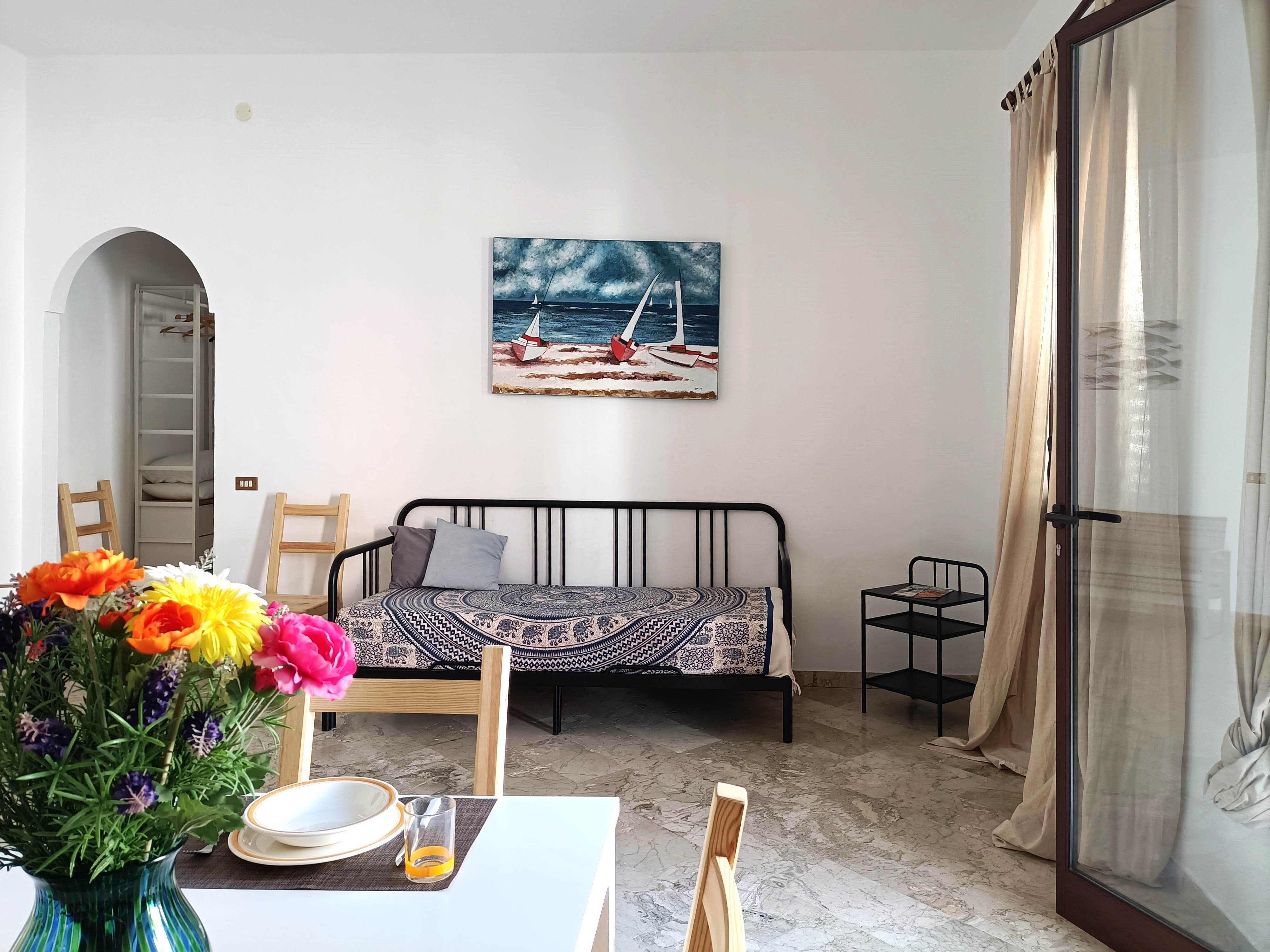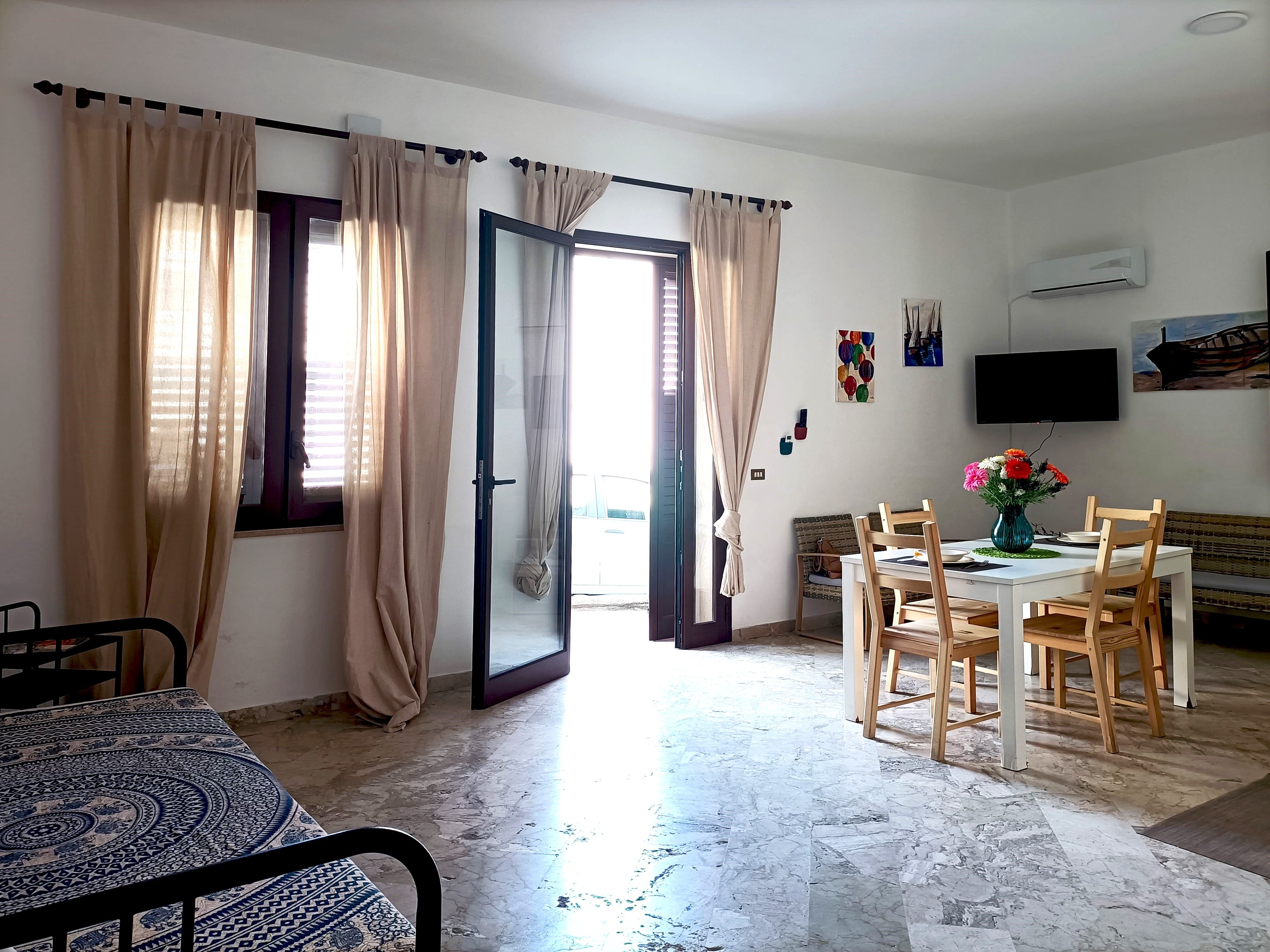 Appartamento di 2 locali di 50 m/q, al piano terra. Arredamento funzionale e confortevole: soggiorno/sala da pranzo con divano 2 letti e TV (schermo piatto), climatizzatore e riscaldamento di aria calda. 1 camera matrimoniale con climatizzatore e riscaldamento di aria calda. Angolo cottura (forno, 2 piastre ad induzione, tostapane, bollitore elettrico, frigo con congelatore, macchina del caffè elettrica). Doccia/bidè/wc. Boiler 50 litri. A disposizione: ferro da stiro, seggiolone, lettino per bimbi fino a 2 anni, asciugacapelli. Internet (wifi, gratis). Pass parcheggio (1 auto) nelle vicinanze della casa