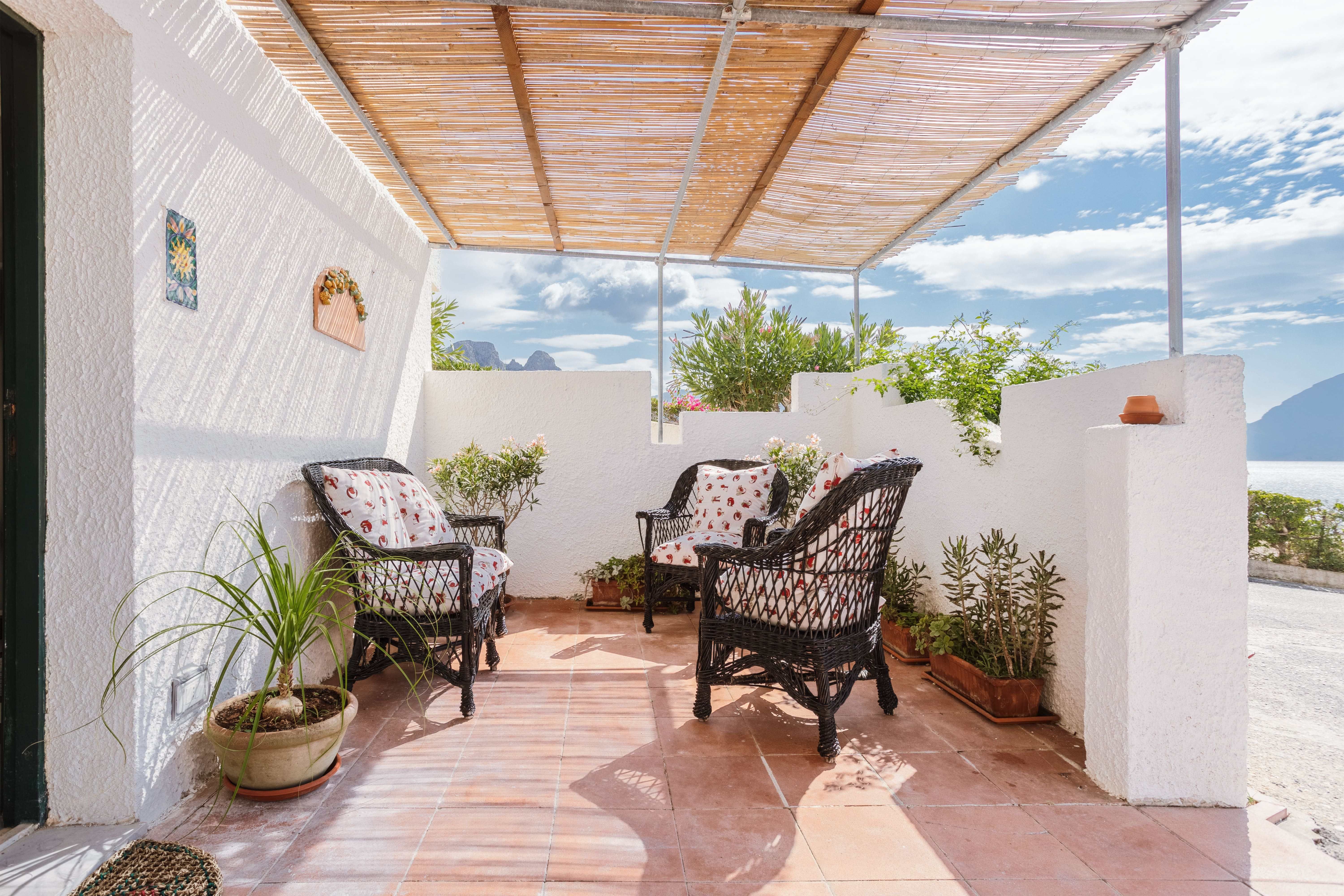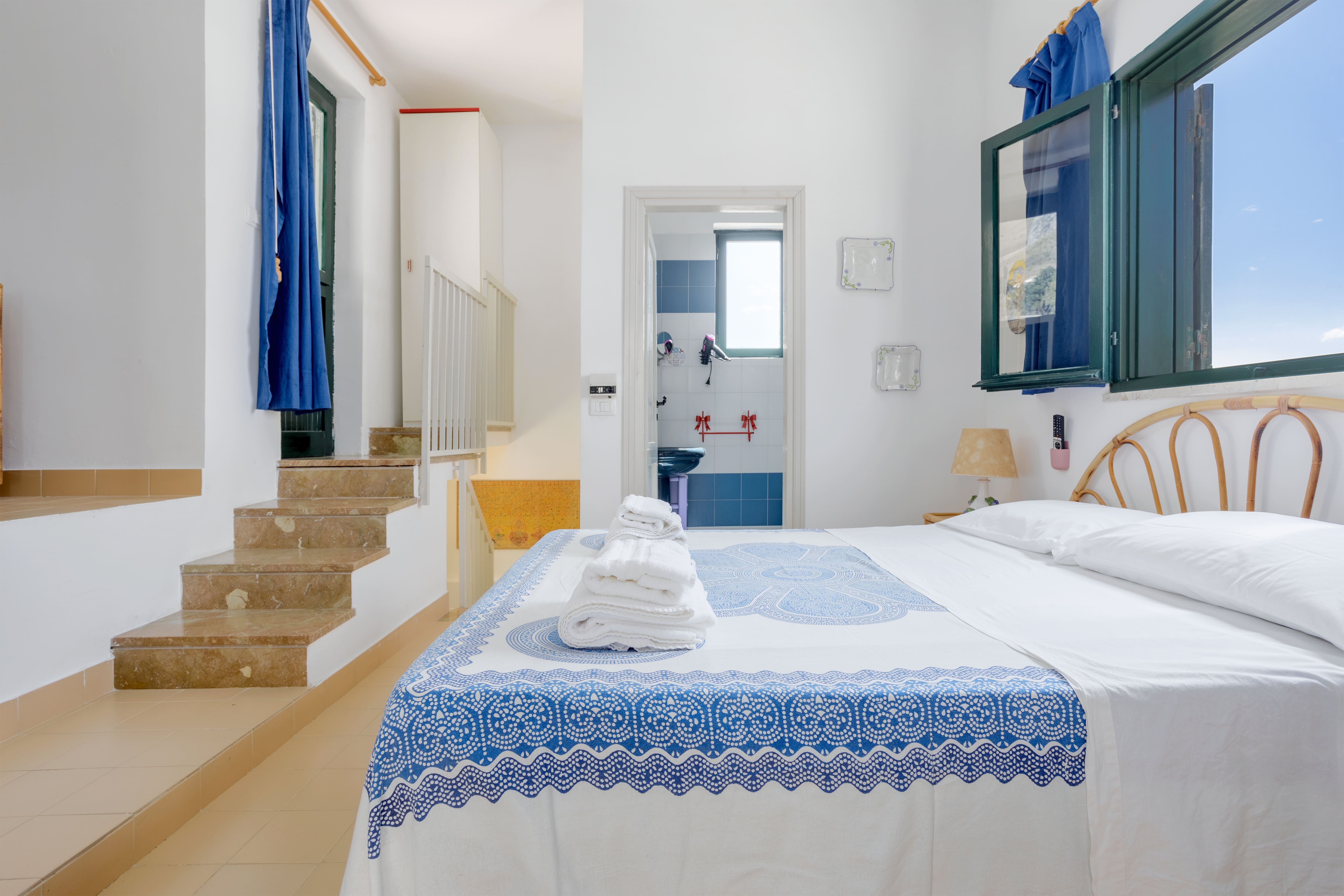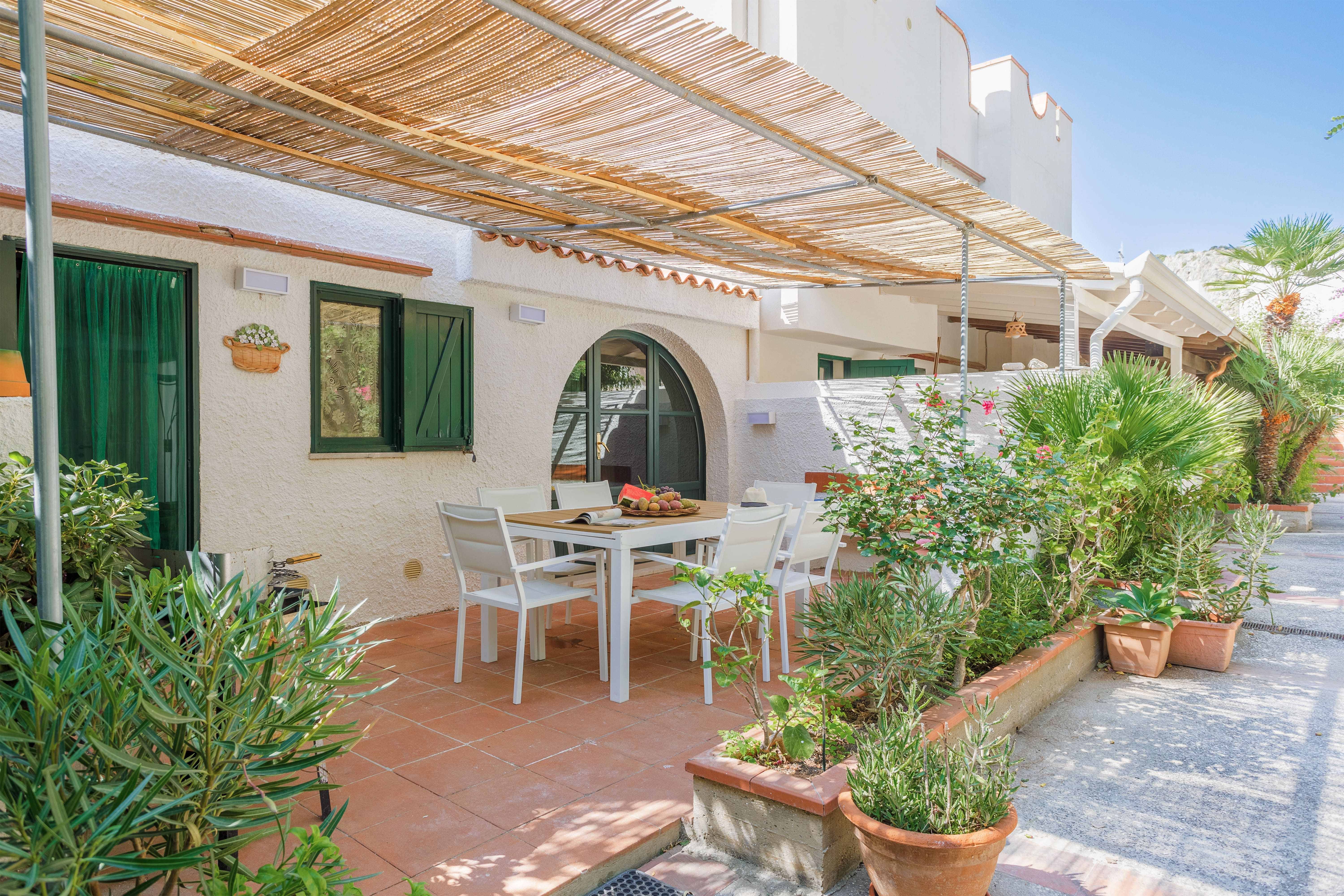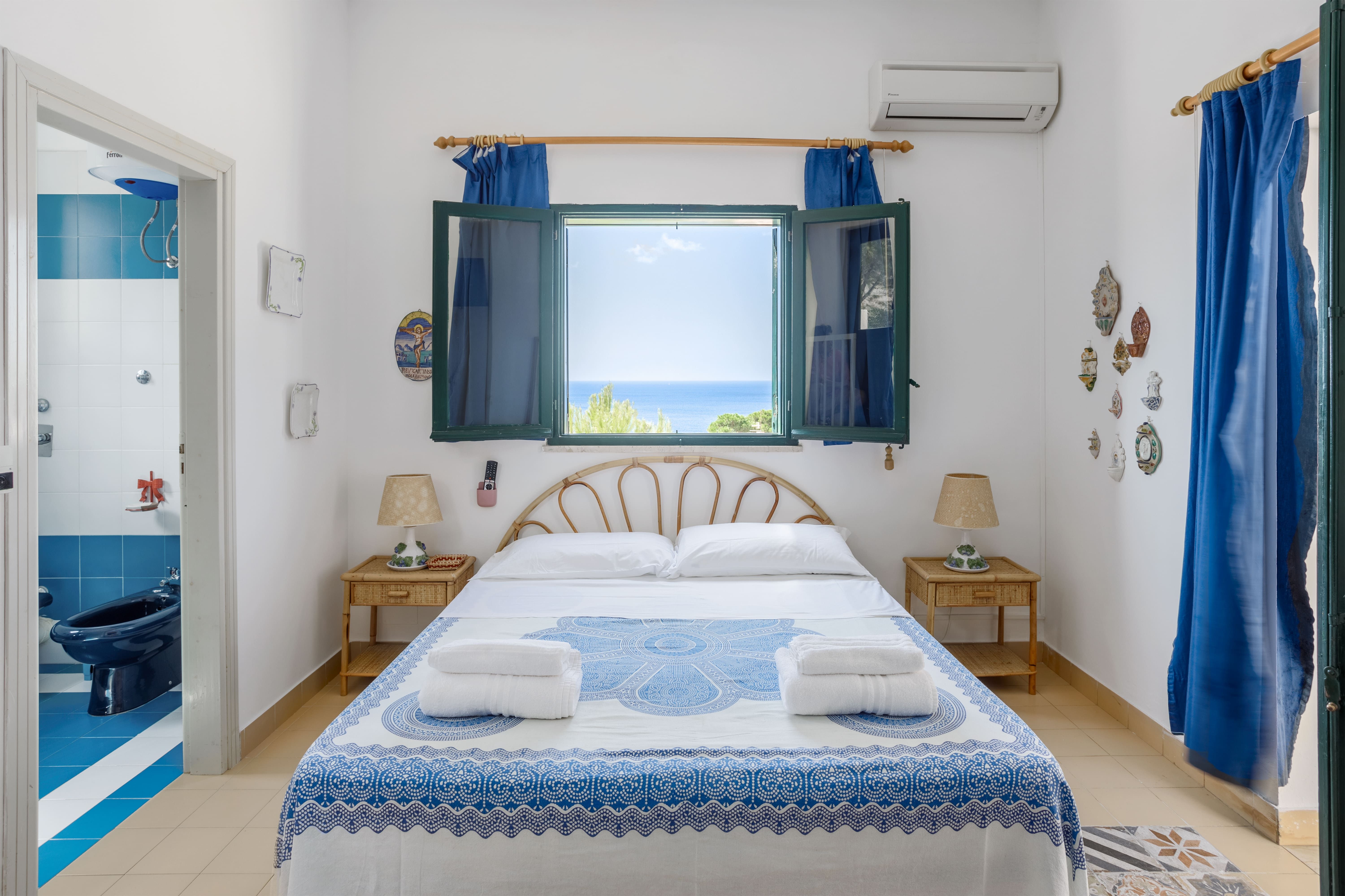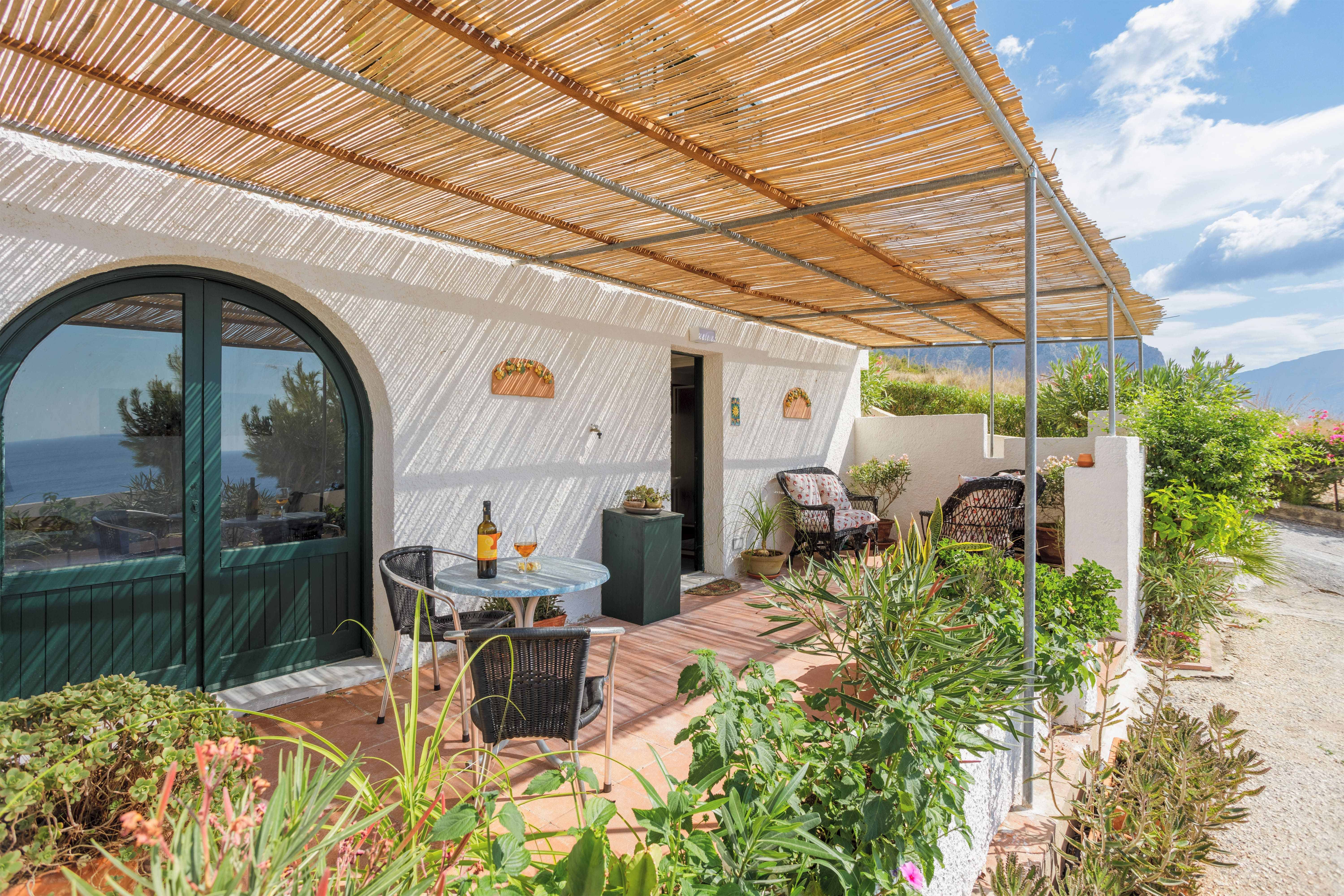 Villetta semi indipendente di 4 locali di 85 mq su 2 piani. Arredamento funzionale e confortevole: entrata da una terrazza vista mare con pergolato di 24 mq con divanetto, poltrone, sedie e tavolino. Ingresso con angolo cottura 4 fuochi. Bagno completo con doccia/bidet/wc. Soggiorno/sala pranzo con divano e TV (schermo piatto 40”). Climatizzazione e riscaldamento di aria calda. 1 cameretta con due posti letto. 1 camera matrimoniale. Uscita su un ulteriore terrazzo di 24 mq attrezzato con tavolo e sedie. Piano superiore: scala interna in muratura. 1 camera matrimoniale con finestra vista mare con climatizzazione e riscaldamento di aria calda. Uscita su 2 terrazze, di cui una di 12 mq coperta con pergolato e attrezzata con sedie a sdraio, l'altra di 14 mq scoperta, entrambe con vista mare. Bagno con lavabo/bidet/wc. Boiler elettrico. A disposizione: forno a microonde, tostapane, frullatore, bollitore elettrico, caffettiera, ferro da stiro, seggiolone, lettino per bimbi fino a 2 anni, asciugacapelli, lavatrice, frigo con congelatore, barbecue. Internet (wifi, gratuito). Parcheggio riservato davanti la villetta (1 auto)